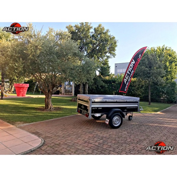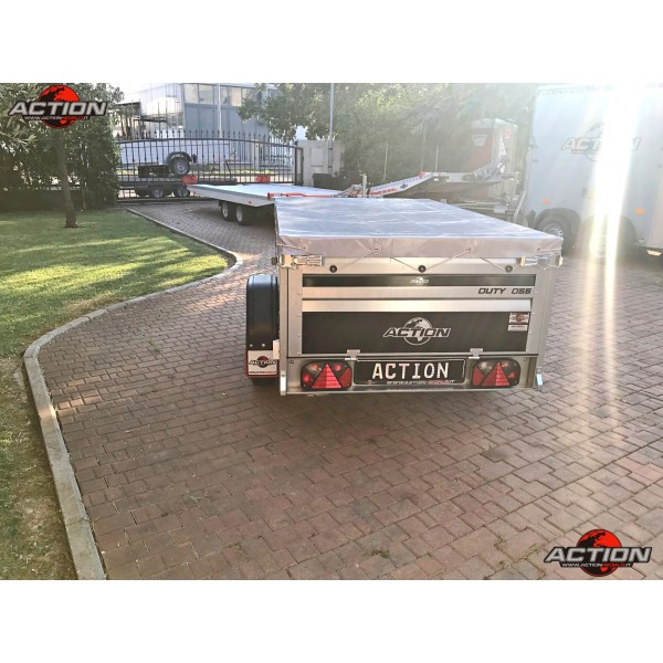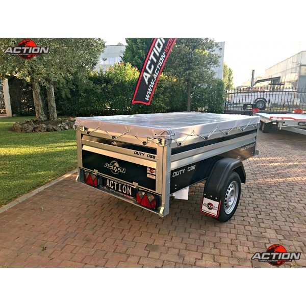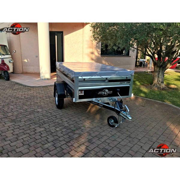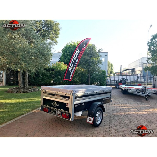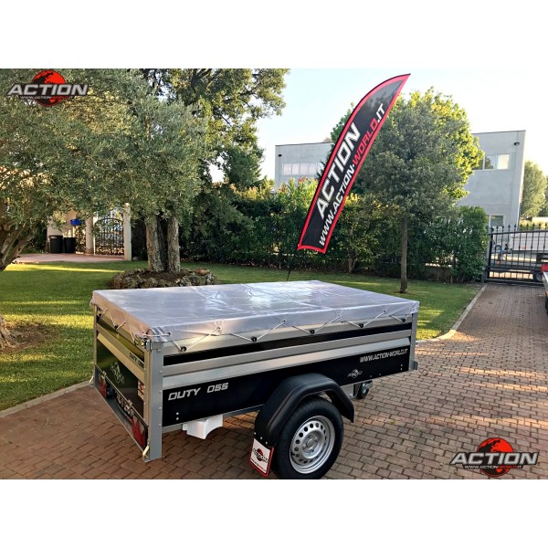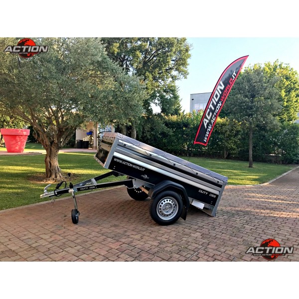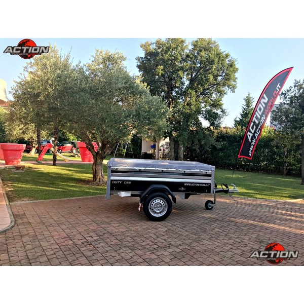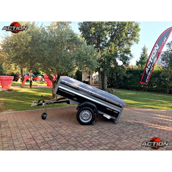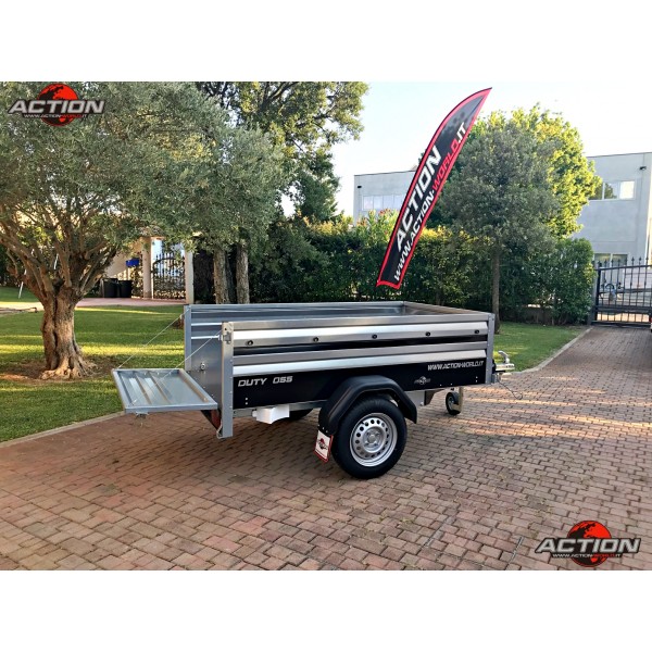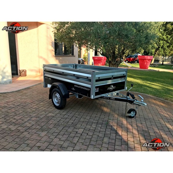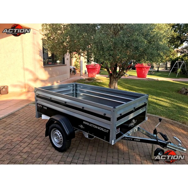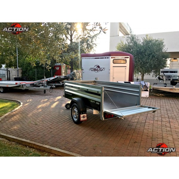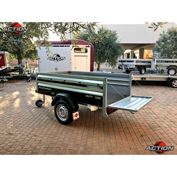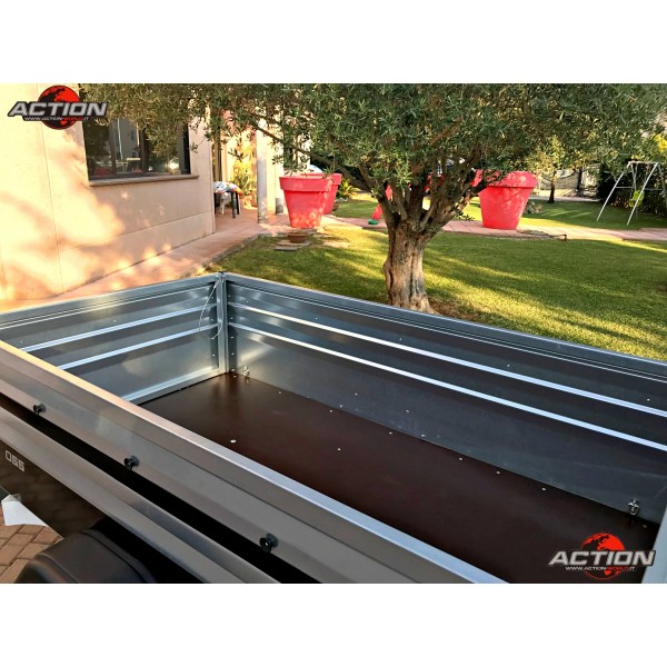 Rimorchio mono asse trasporto cose senza freno con ruote esterne, pianale basculante
